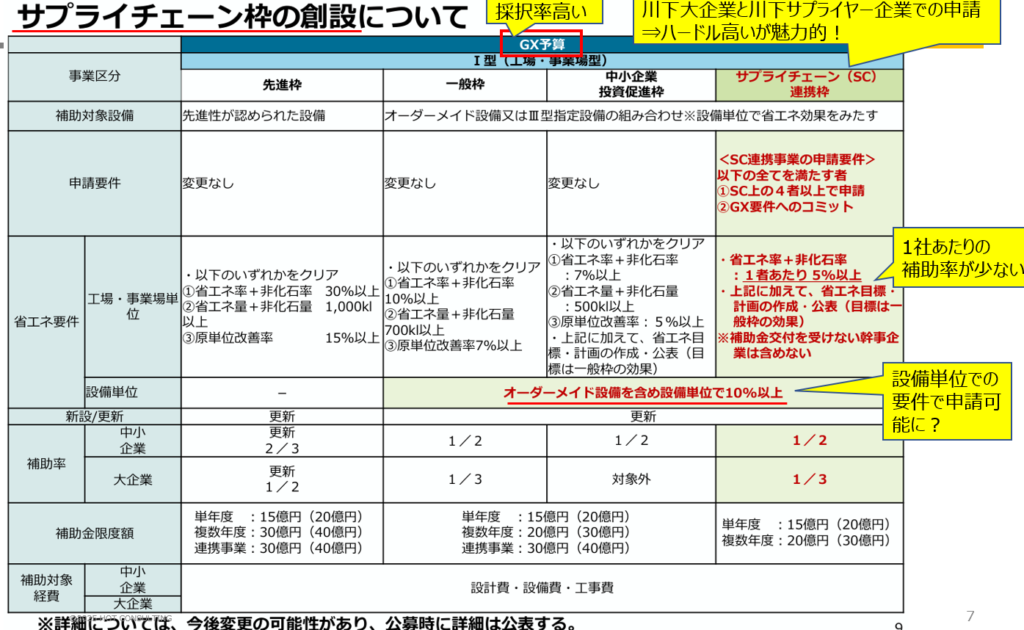 Ⅰ工場事業場型:先進枠、一般枠、中小企業投資促進枠。新設:サプライチェーン連携枠