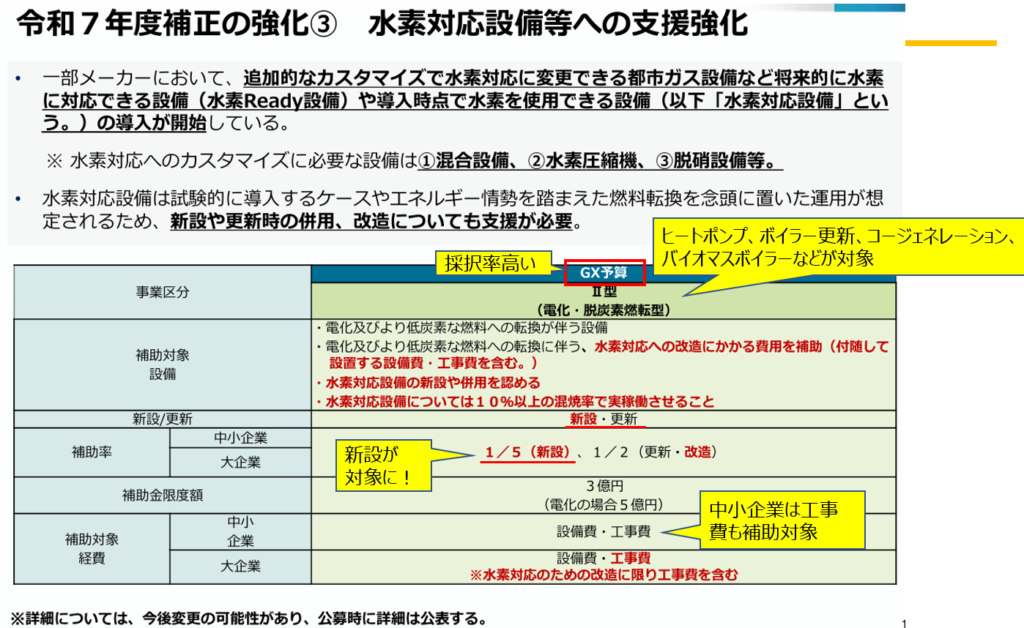 補助対象経費:設備費、水素対応改造工事、中小企業は工事費も含む