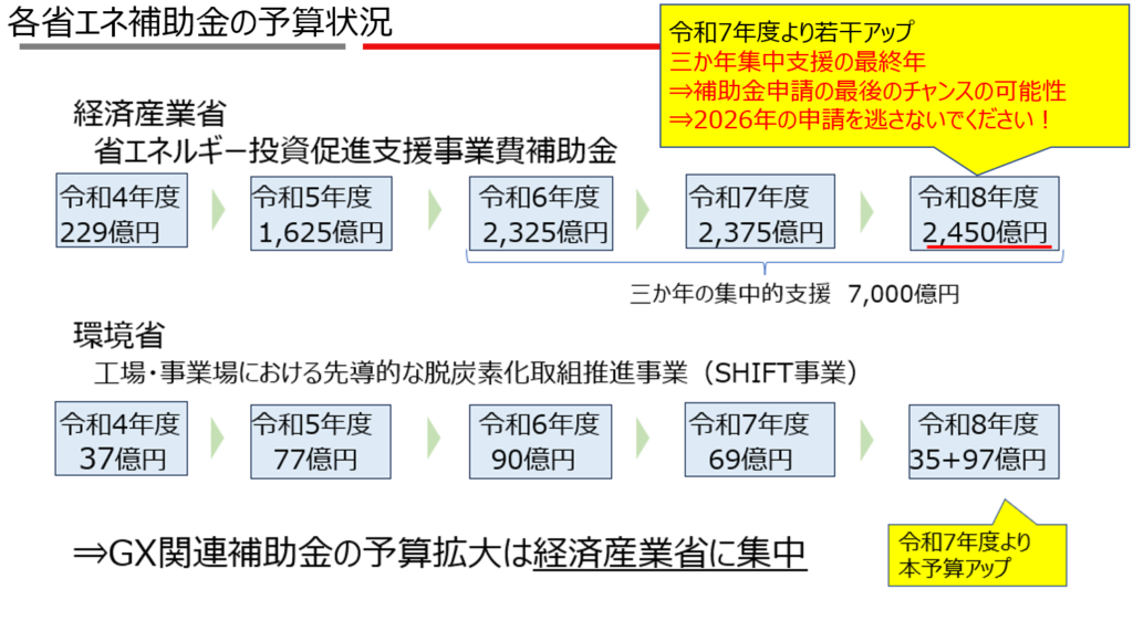 非常に大きな予算で高い採択率である経産省の省エネ補助金ですが、2026年は3か年集中支援の最終年となります。オイシイ状況は最後になるかもしれませんので、このボーナス・チャンスを逃がさないように準備・申請しましょう。