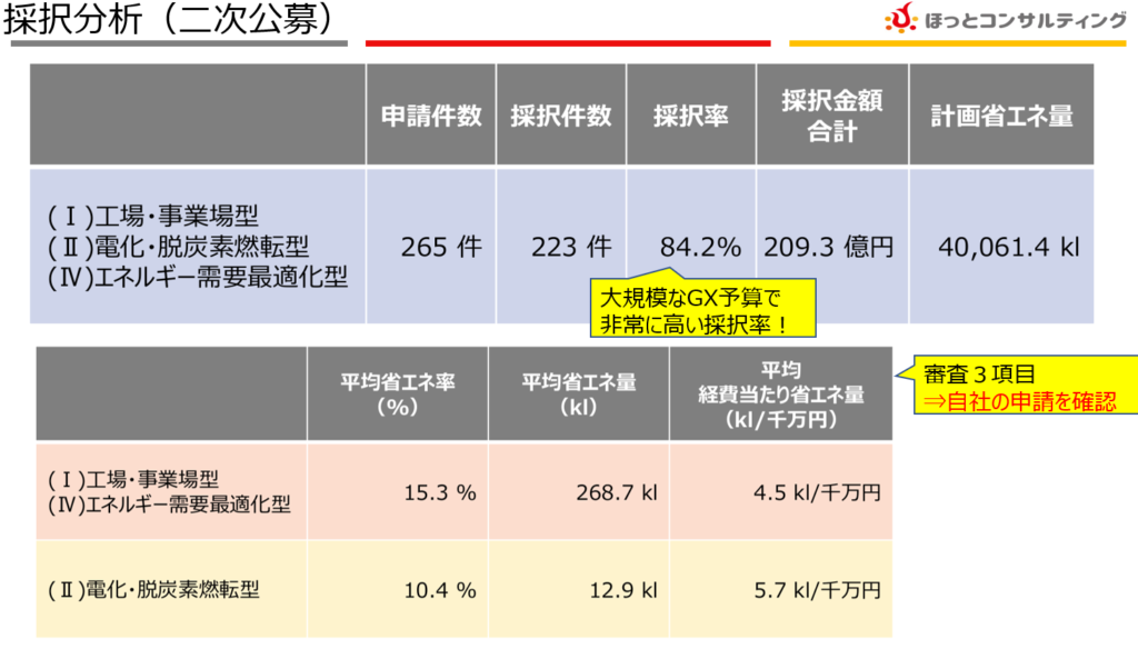 ・3つの審査項目(省エネ率、省エネ量、経費当たり省エネ量)の採択平均値と自社の申請値を比較し、劣後していないかチェックしましょう。