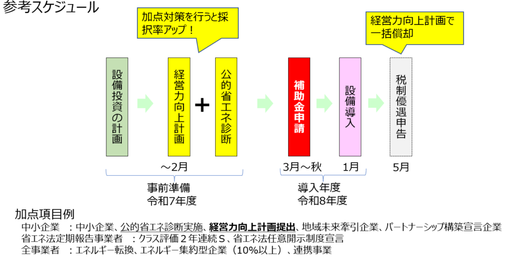 経営力向上計画と公的省エネ診断が加点になります。経営力向上計画は優遇税制の対象になりますので、節税面でも有効です。